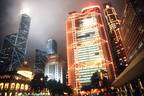 Shanghai and Hong Kong Bank headquarters, which is the brightly lighted builiding on the